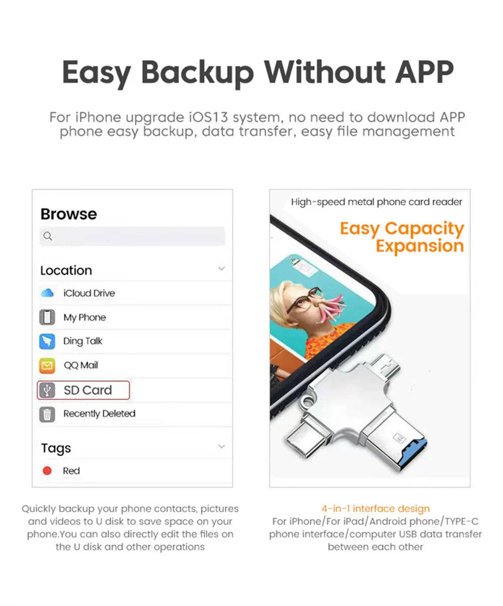 In addition to its functional benefits, the 4 In 1 SD TF Memory Card OTG Adapter also supports high-speed data transfer, allowing you to move large files quickly and efficiently β‘. This means less time waiting and more time getting things done, whether you're backing up photos from a vacation or transferring important work documents πΈπΌ.
